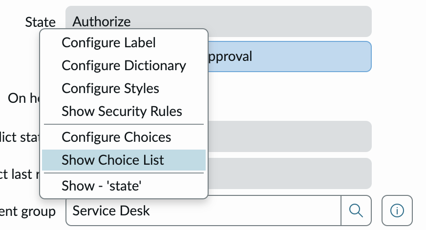 To see choices available for a particular field e.g., State, right click on the field and click on Show Choice List to see the available choices for use in the steps: