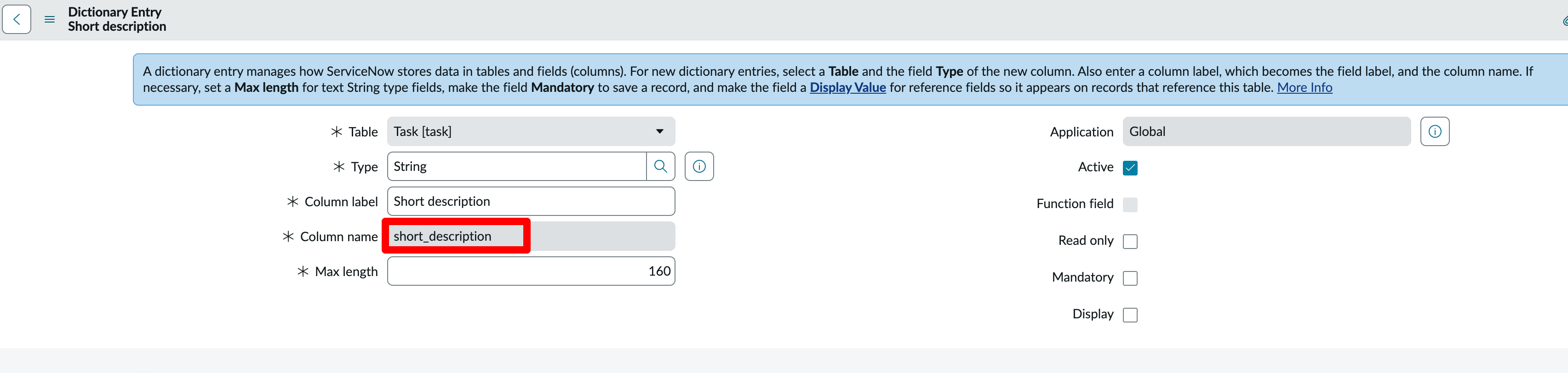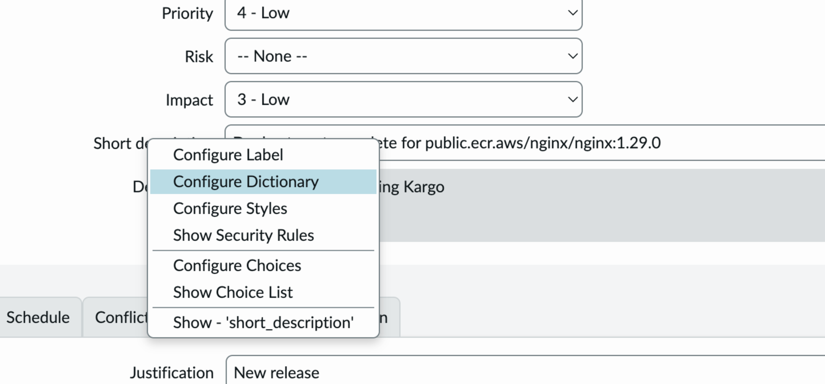 Most of the time you cannot use the field labels you see in the ServiceNow UI as keys in the step configuration. For example, if you want to set the value for the “Short description” field: